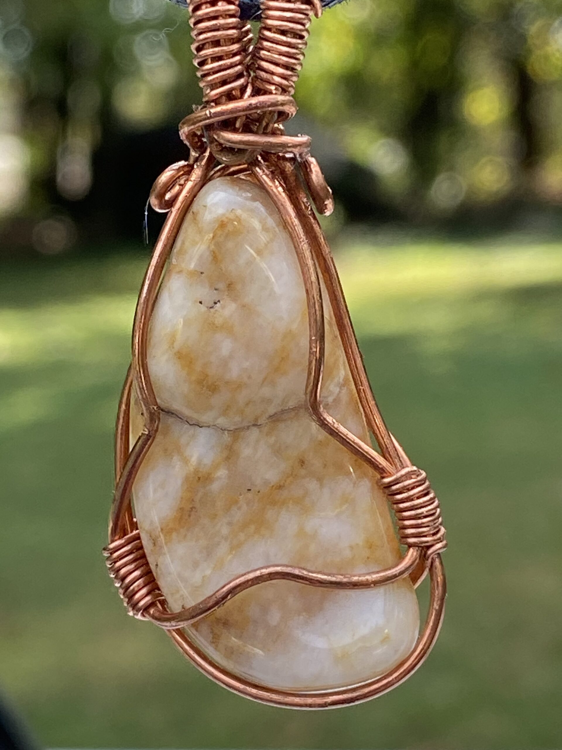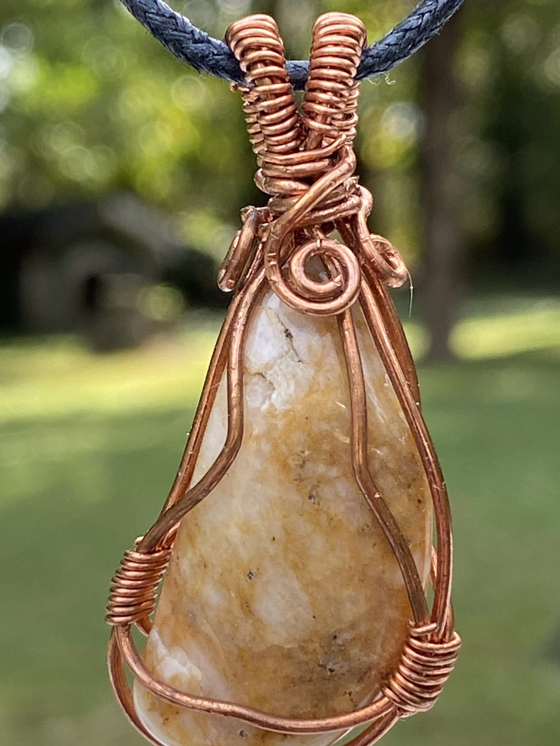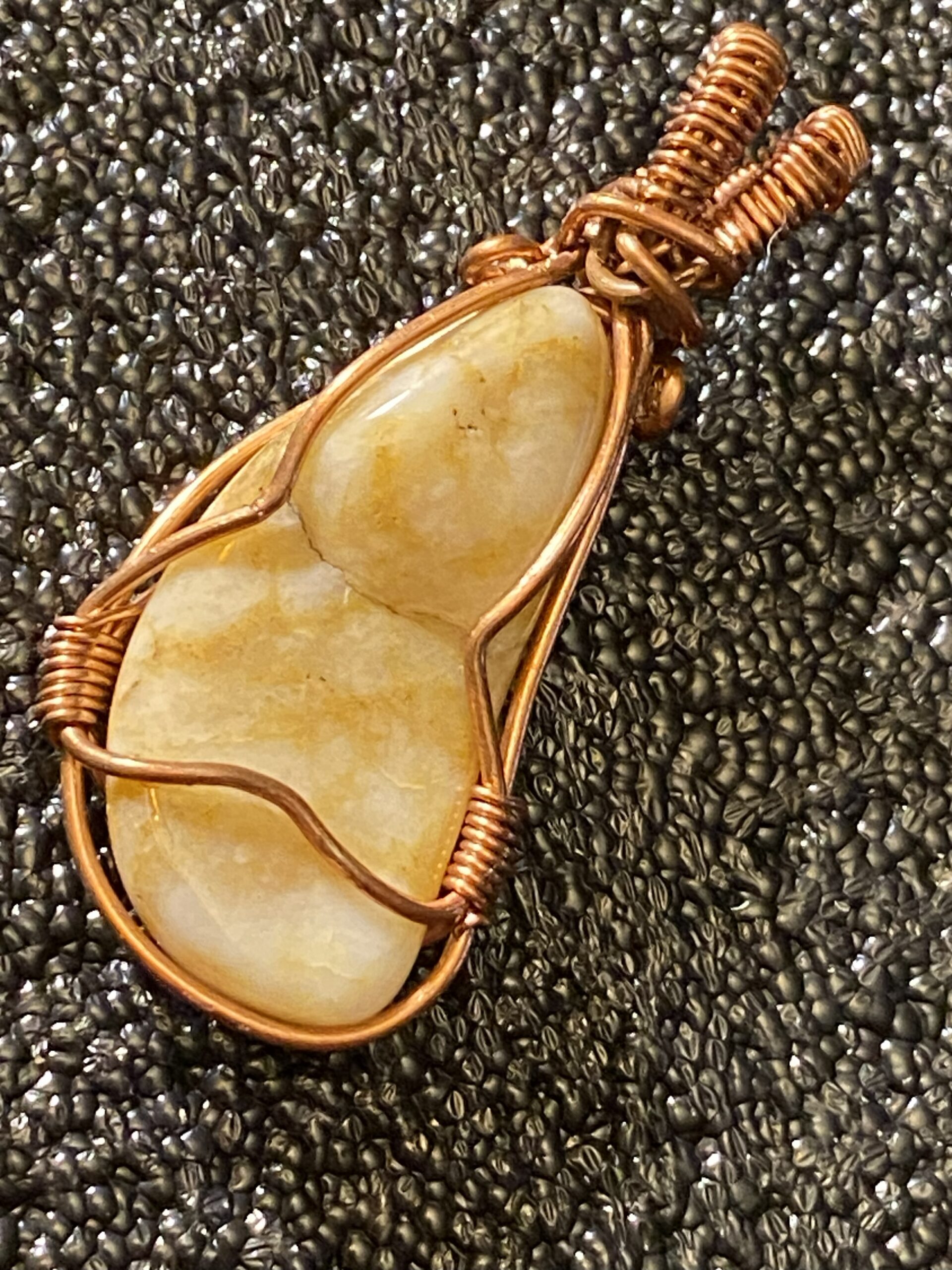Handmade copper wire wrapped stone pendant with small swirl accents. This is made with a thicker wire.