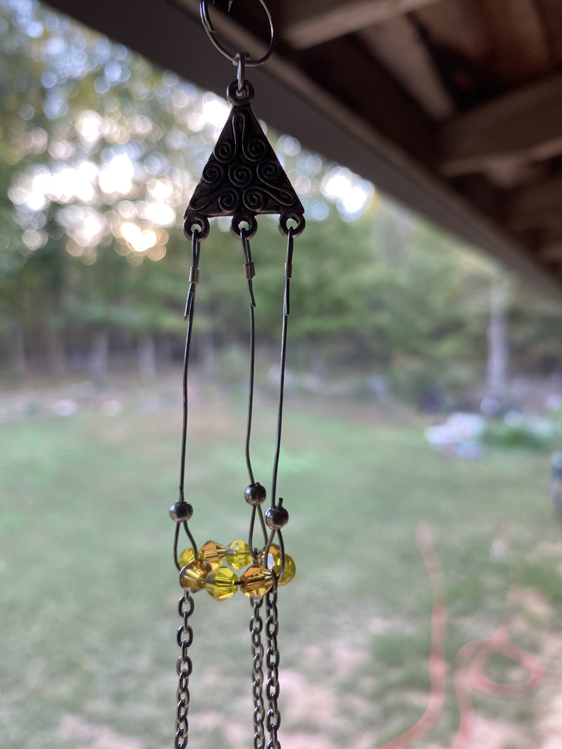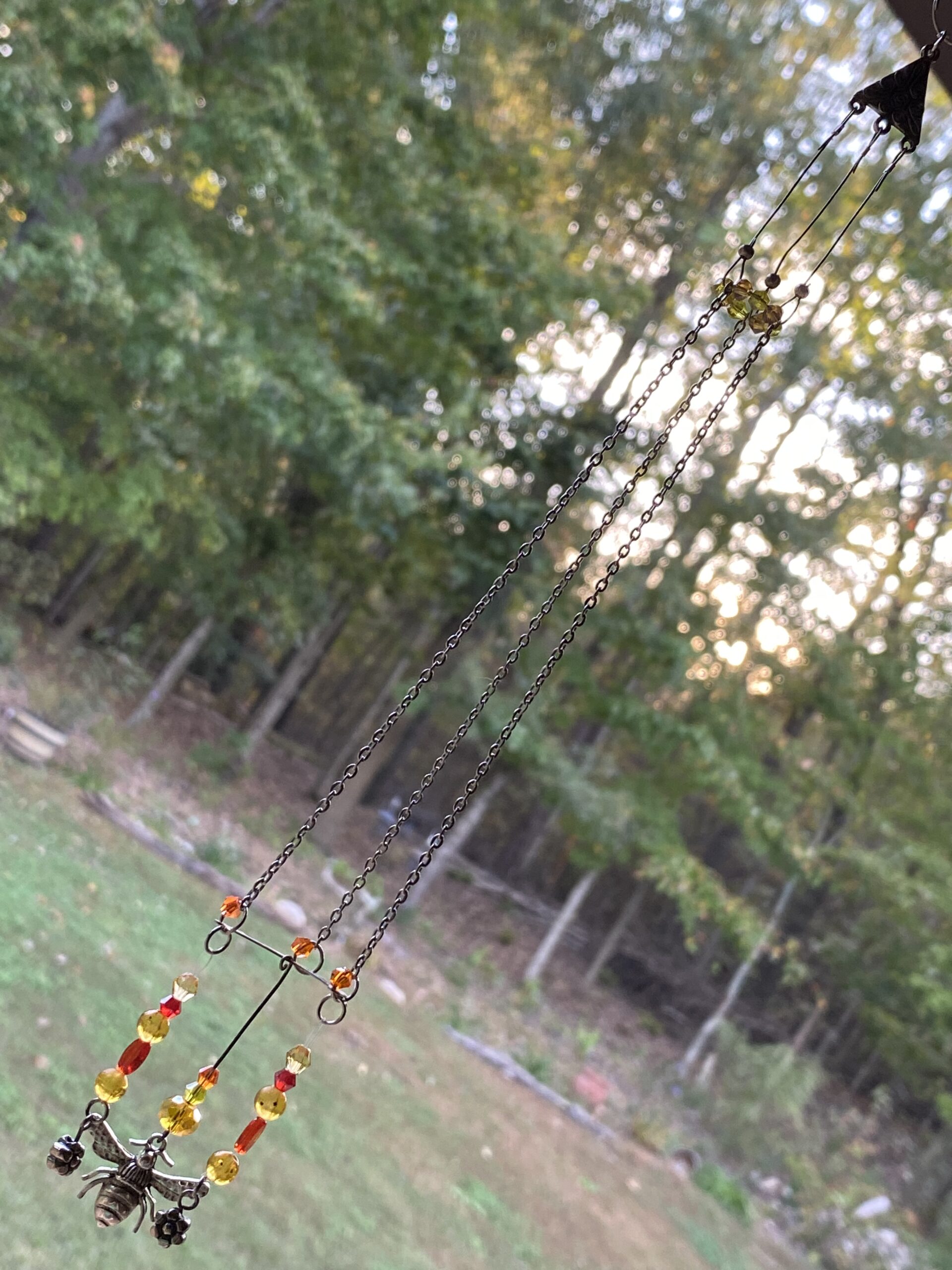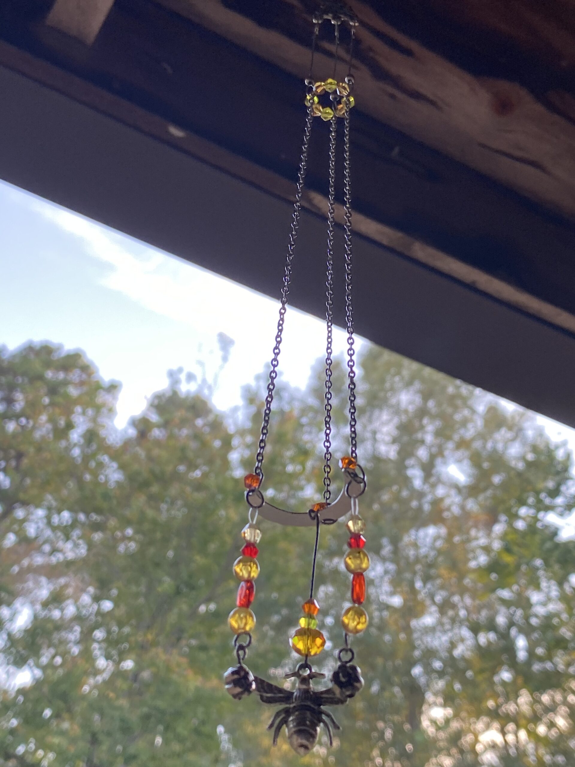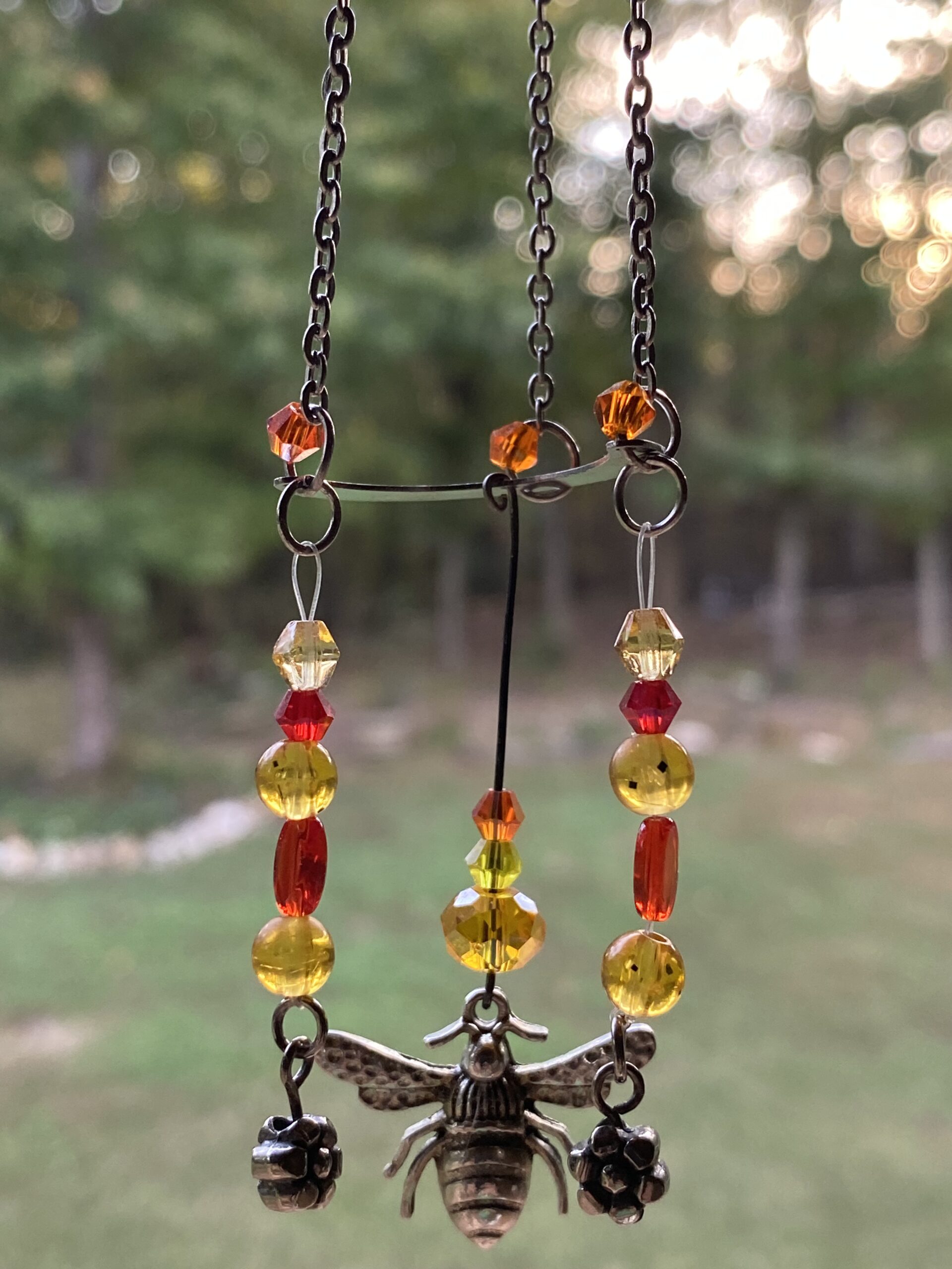 This suncatcher features various orange and yellow beads and crystals with a silver toned metal bee charm . Attached with recycled chains and other various pieces.