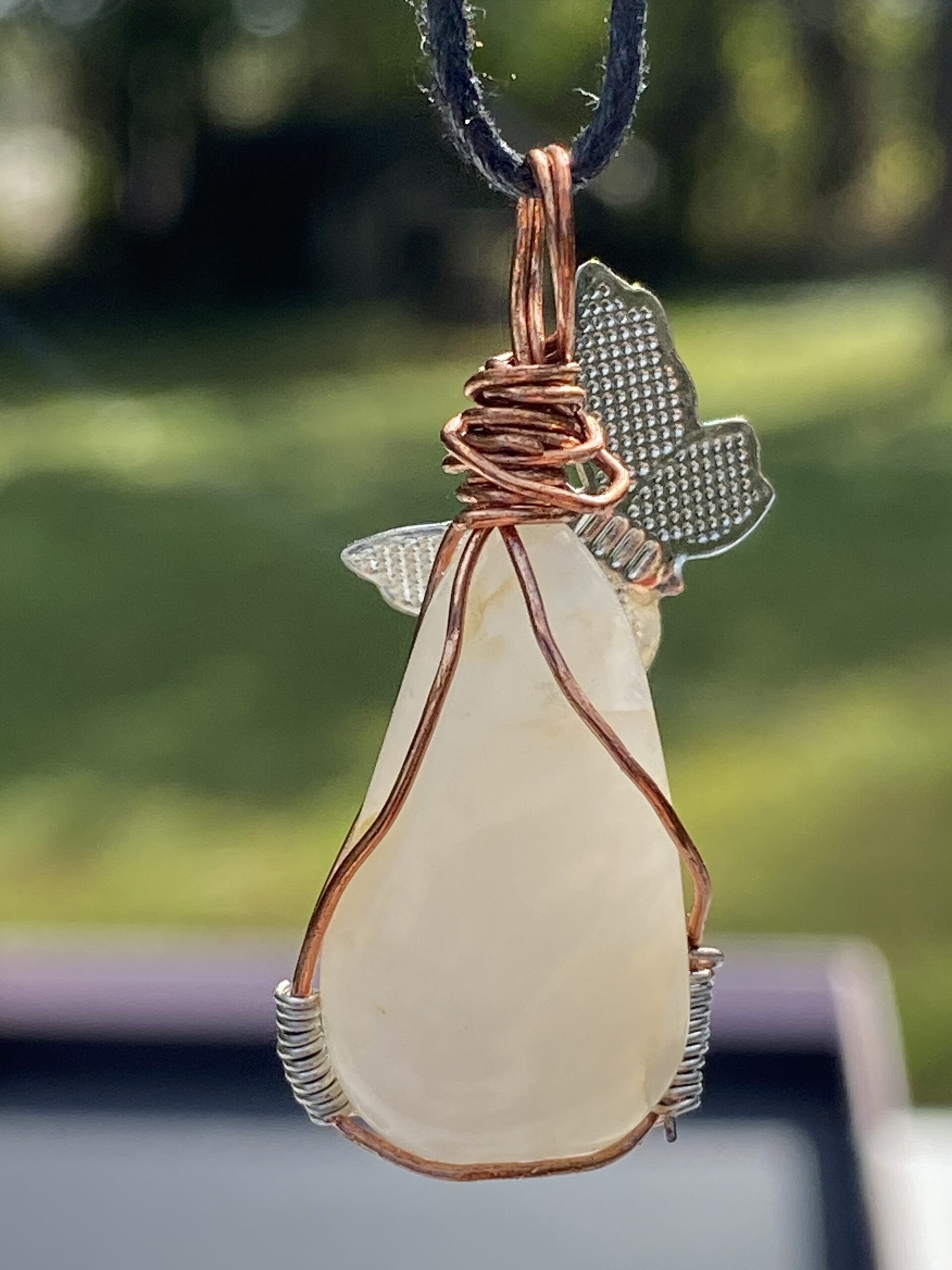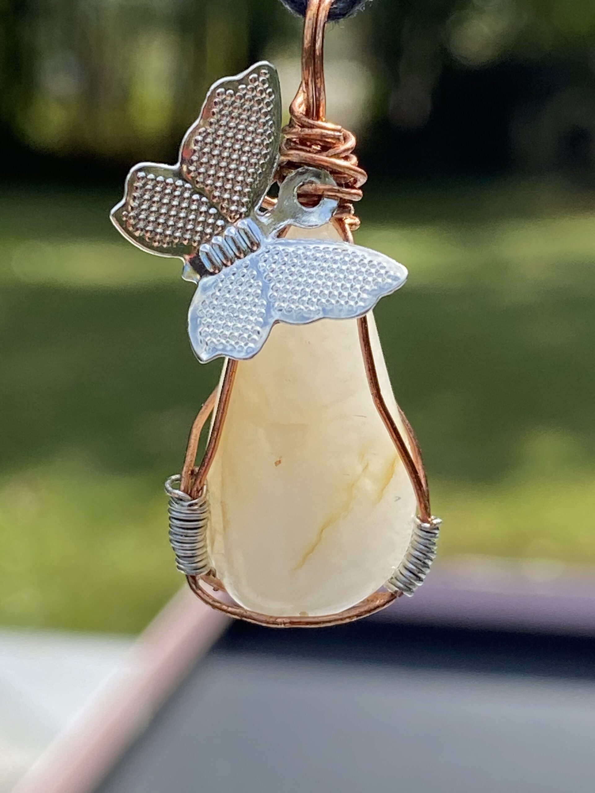 Small, tear drop shaped, copper wire wrapped with silver toned butterfly accent.