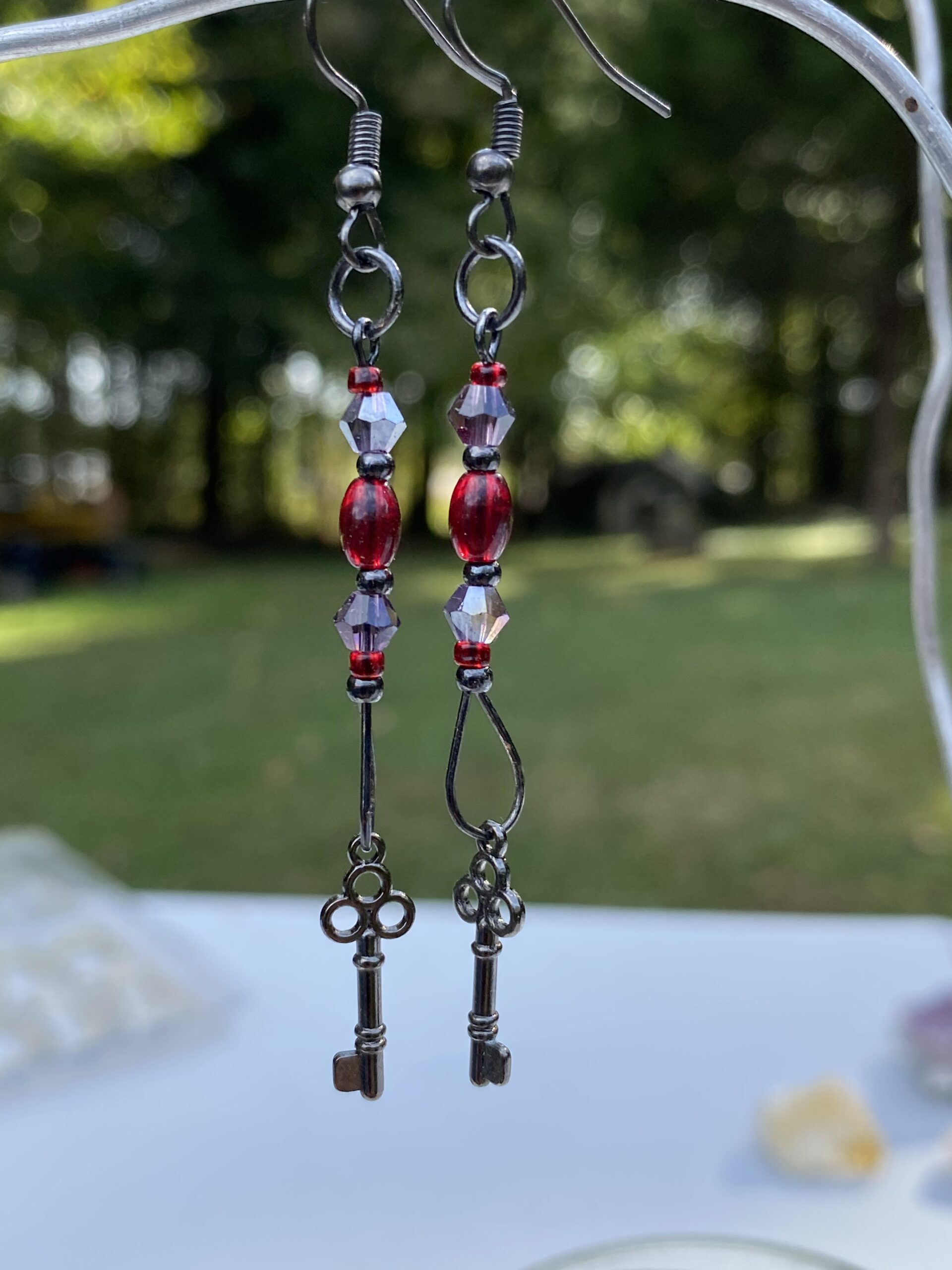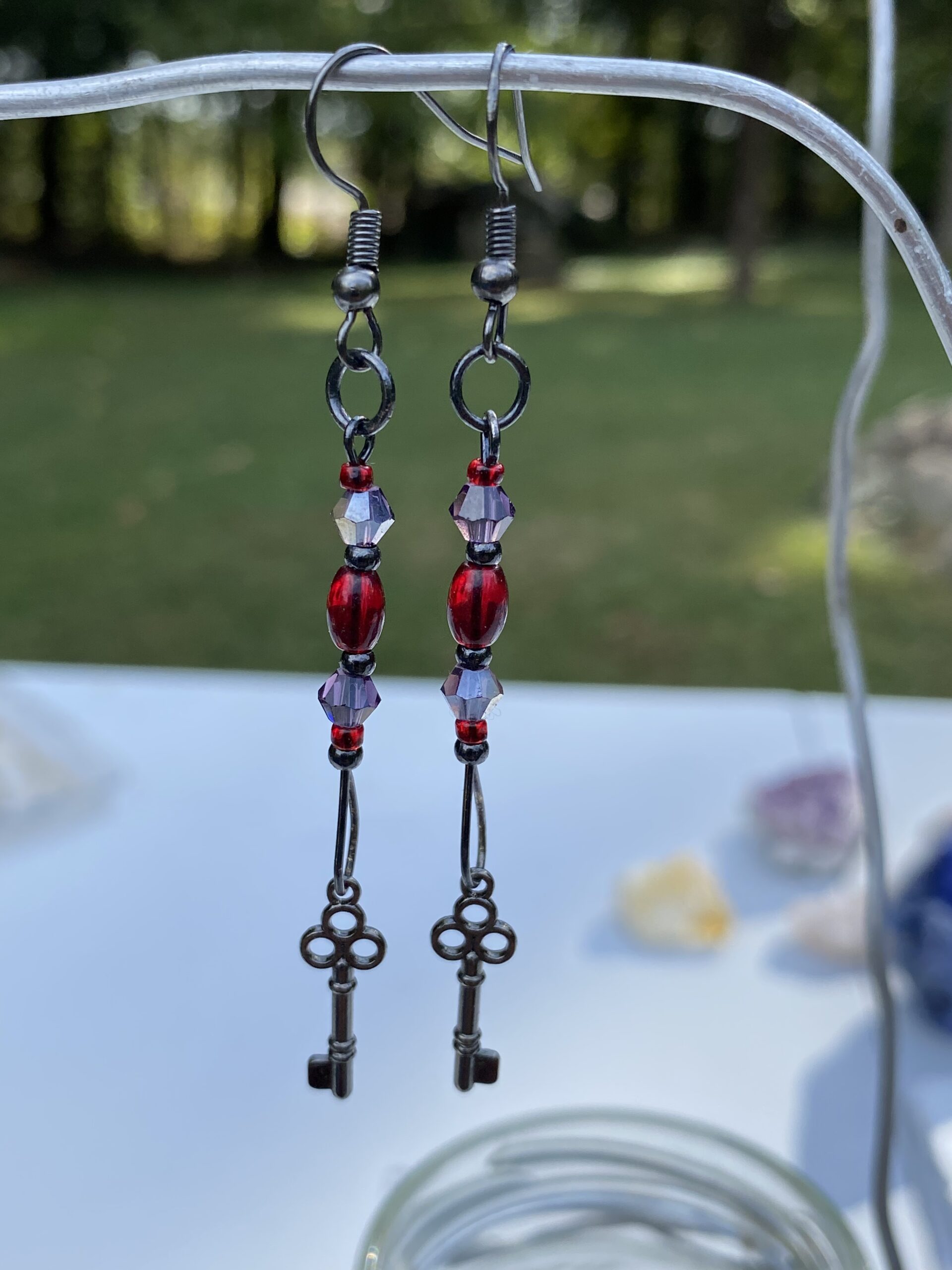 Handmade beaded drop earrings featuring skeleton key charms, red oval glass beads, and small purple crystal bicone beads.