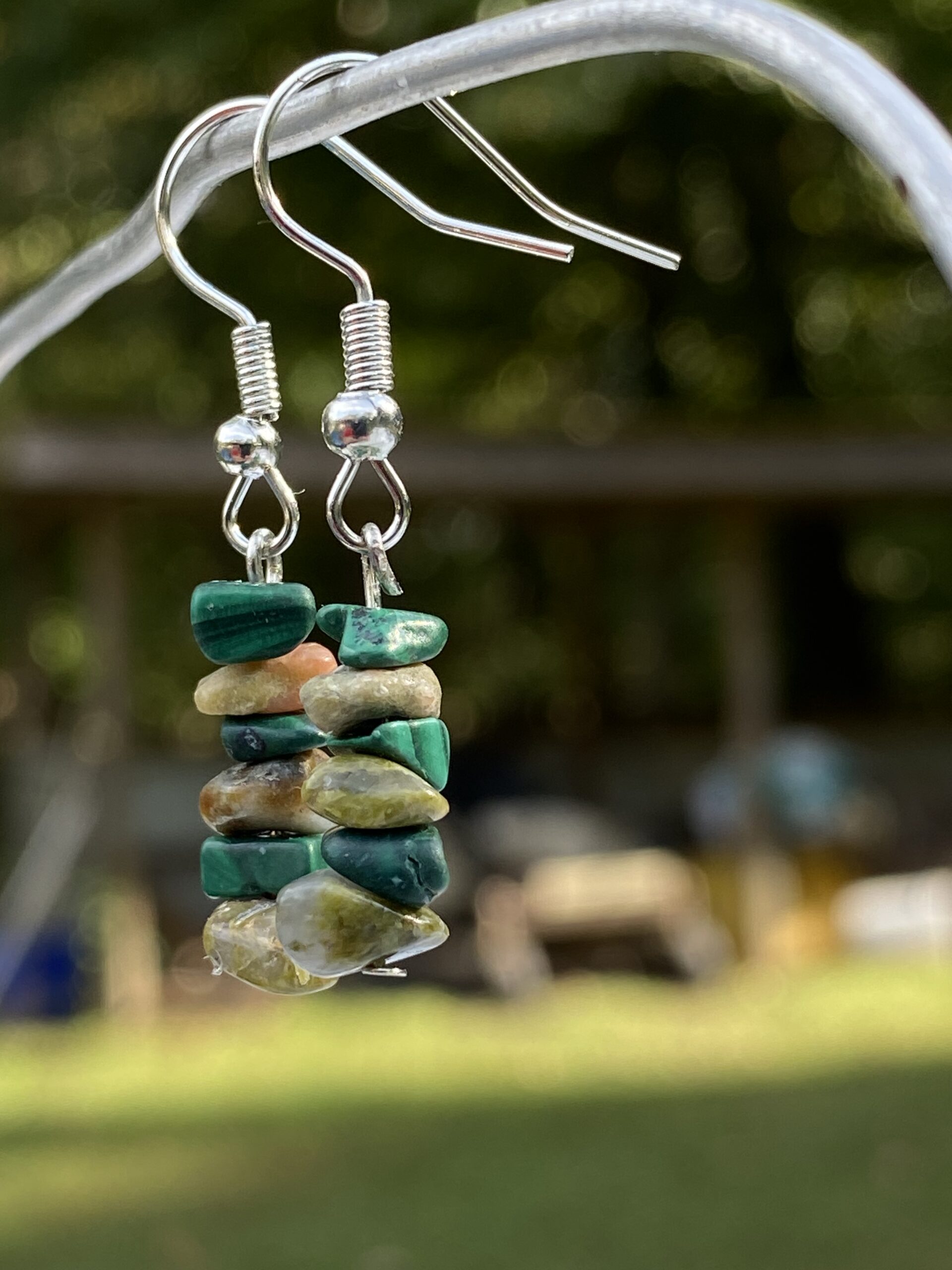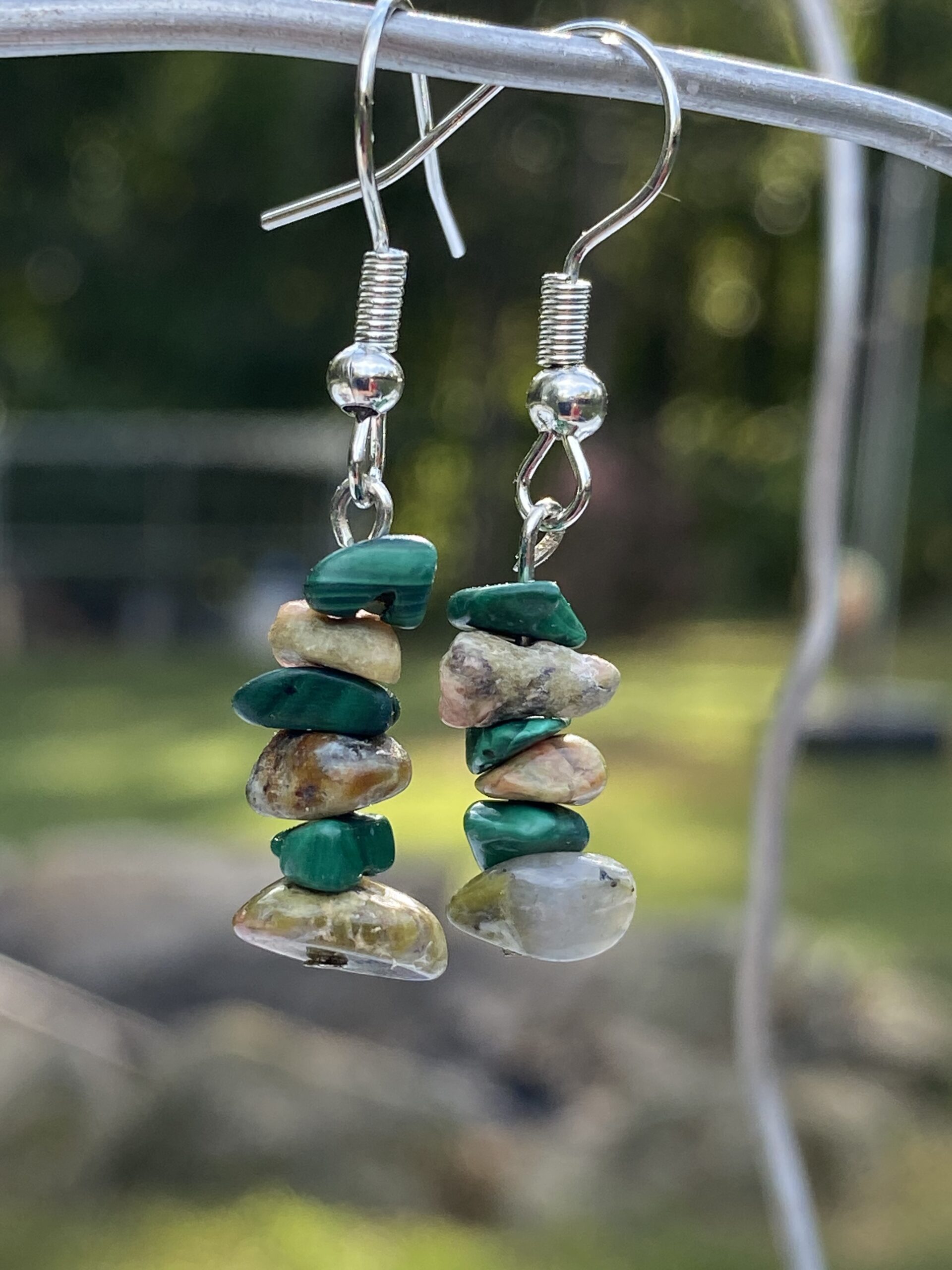 Bohemian style malachite and unakite chipped stone stacked earrings.