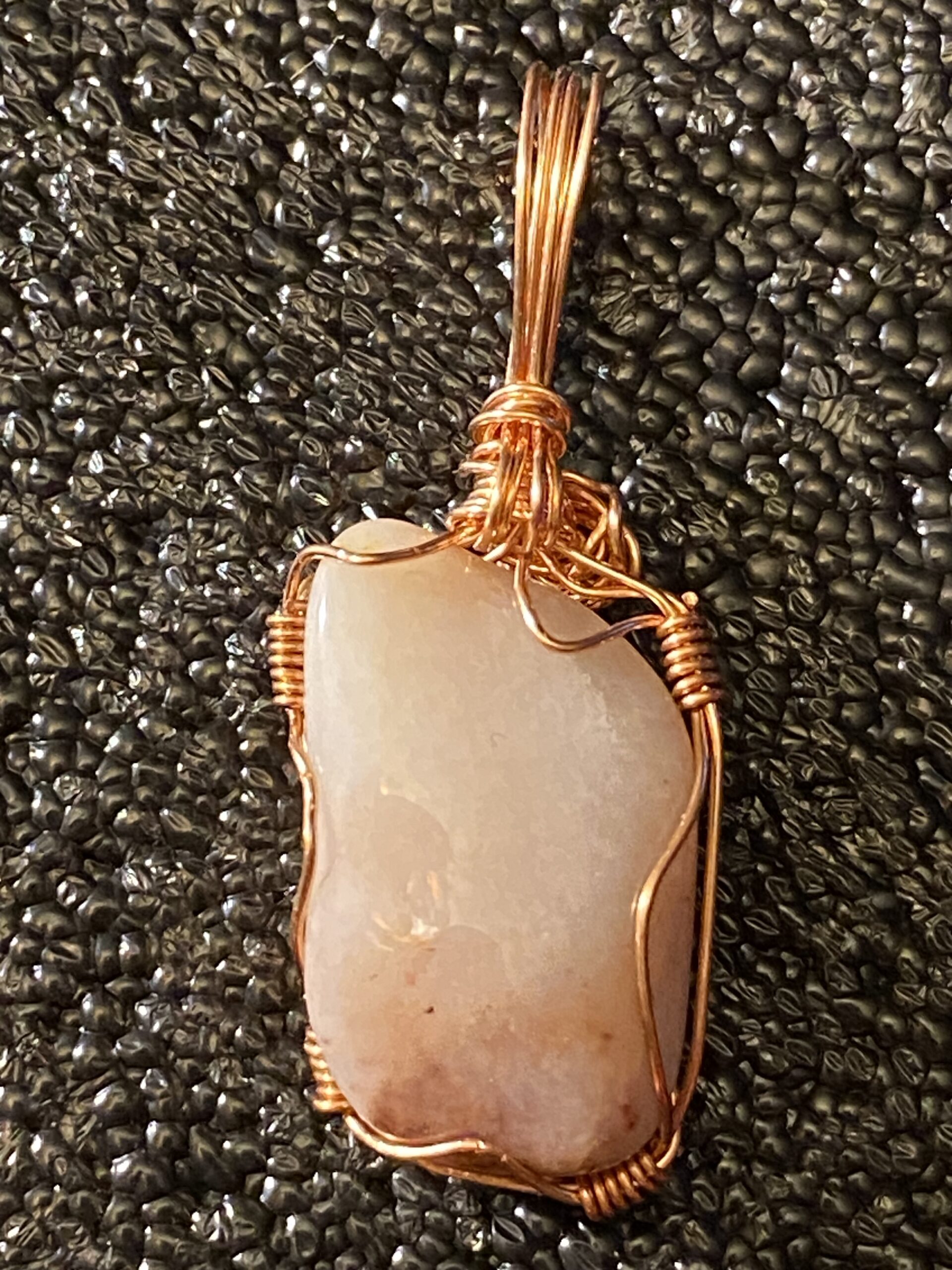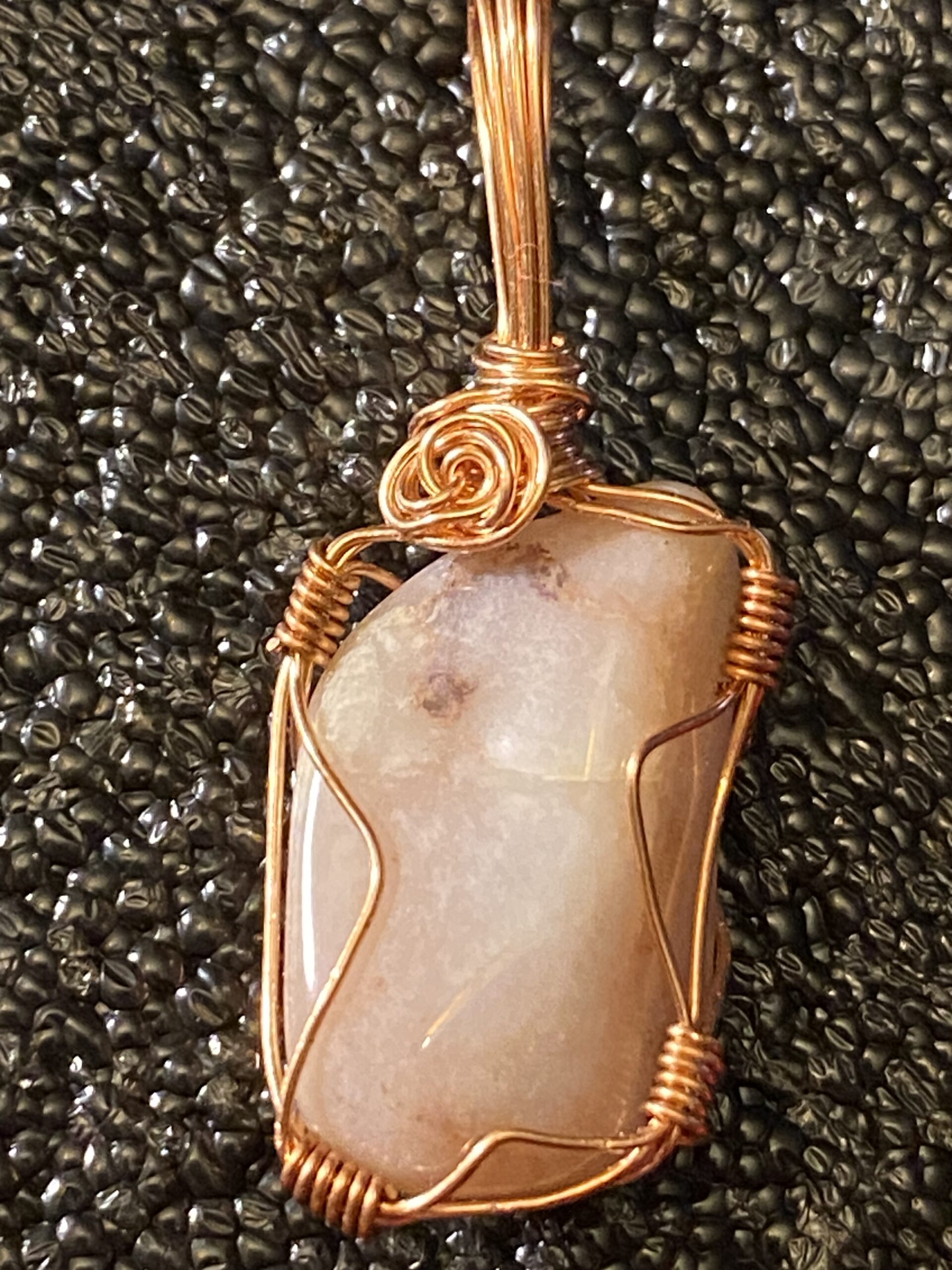 This is a light pink and white in color Wyoming wire wrapped stone with rose accent.