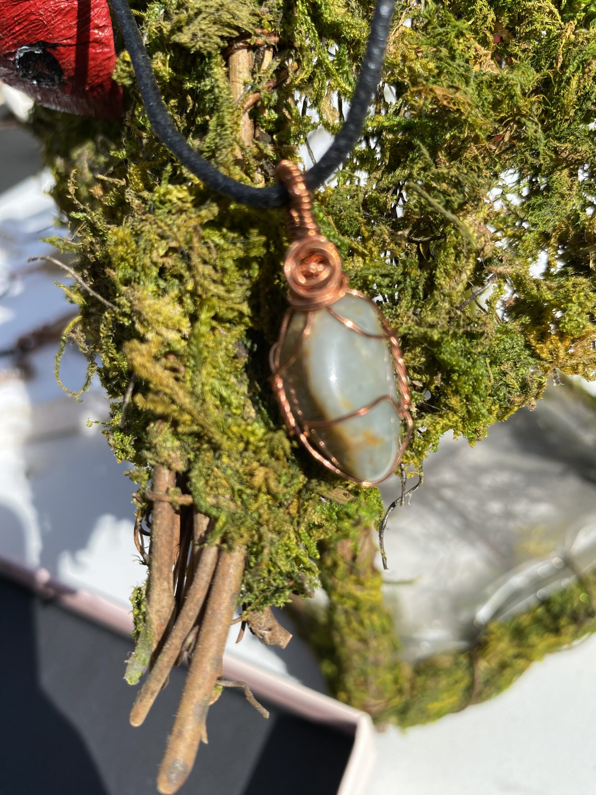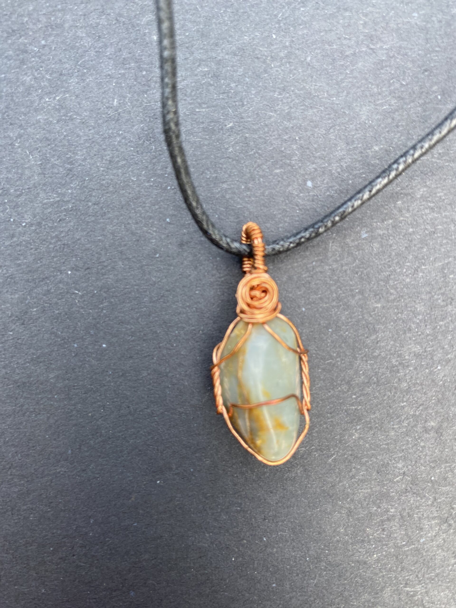 This Wyoming stones appearance changes in the light from a deep almost olive green to lighter green in the light with brownish color running throughout. It has a small copper rose accent at the top. This a beautiful little piece.