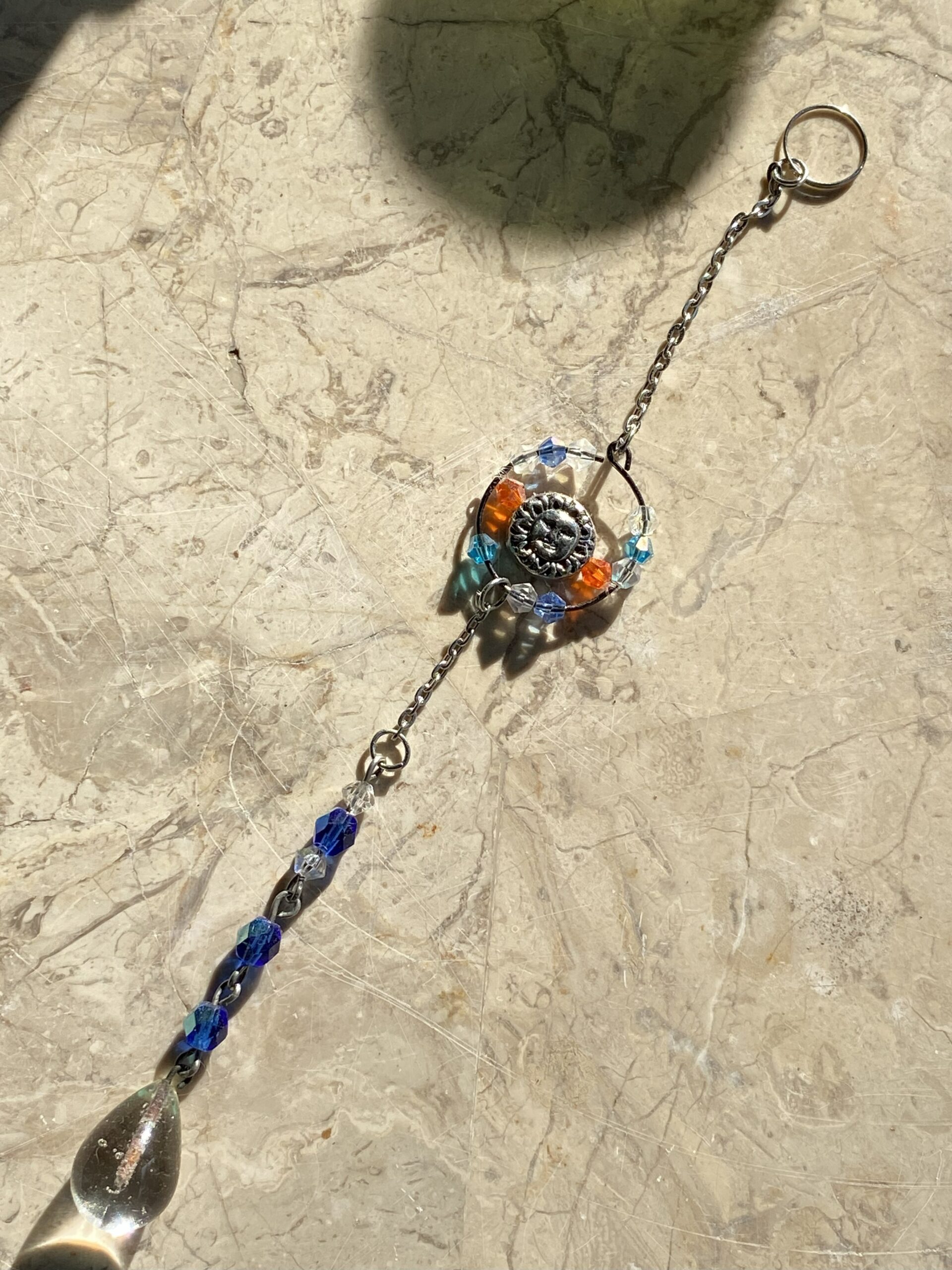 This handmade suncatcher is made with smaller blue and clear faceted beads with a large, clear tear-drop shaped glass pendant at the bottom. At the top are more faceted, muti-colored beads surrounding a reversible sun and moon “bead”. The tear-drop shaped pendant and crystal beads at the bottom are recycled from old jewelry.